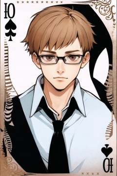 1boy, male focus, glasses, solo, brown hair, brown eyes, white background, simple background, shirt, short hair, white shirt, card, adjusting eyewear, playing card, collared shirt, jacket, <lora:Ishida Sui:0.8>
