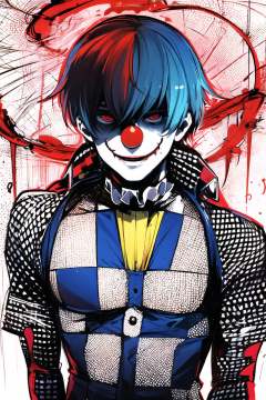 1boy, male focus, clown, heart, solo, white background, simple background, upper body, checkered clothes, blood, smile, <lora:Ishida Sui:0.9>