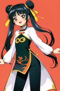 1girl, Li Meiling, solo, double bun, hair bun, black hair, long hair, brown eyes,  smile,  hair ribbon, open mouth, long sleeves, blush, chinese clothes,  bangs, twintails,  simple background, <lora:Card Captor Sakura Anime:0.8>