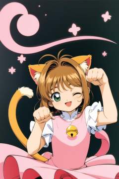 1girl, kinomoto sakura, animal ears, one eye closed, cat ears, solo, tail, brown hair, bell, green eyescat tail, magical girl, dress, paw pose, short hair, smile, open mouth, 1990s (style), retro artstyle, ;d, jingle bell, wand, looking at viewer, pink dress, antenna hair,   <lora:Card Captor Sakura Anime:0.8>