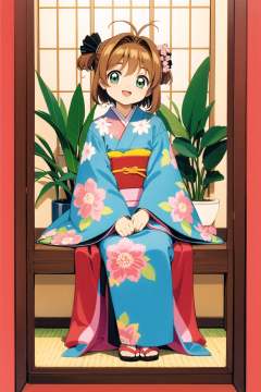 kinomoto sakura, 1girl, japanese clothes, seiza, kimono, brown hair, floral print, flower, vase, long sleeves, obi, green eyes, sitting, sash, 1990s (style), indoors, bangs, antenna hair, short hair, smile, looking at viewer, kero, retro artstyle, hair intakes, hand fan, open mouth, potted plant, print kimono, plant, hair ornament, wide sleeves, full body, solo, head tilt, :d, orange kimono, two side up, zabuton, female child, ribbon, picture frame, <lora:Card Captor Sakura Anime:0.8>