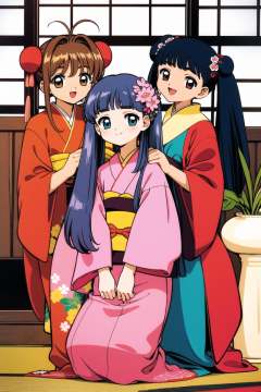 multiple girls, chinese clothes, double bun, daidouji tomoyo, hair bun, china dress, 3girls, Li Meiling, long hair, smile, brown hair, floral print, dress, bangs, japanese clothes, hair ornament, kimono, 1990s (style), flower, blue dress, open mouth, kinomoto sakura, green eyes, twintails, hair flower, blue hair, sitting, bow, blue eyes, short hair, retro artstyle, :d, sash, blunt bangs, long sleeves, indoors, seiza, looking at viewer, hair intakes, short sleeves, red bow, hair bow, antenna hair, blue kimono, standing, obi, black hair, kneeling, wide sleeves, red eyes, closed mouth, grey hair, pink flower, print kimono, vase, bun cover, brown eyes,   <lora:Card Captor Sakura Anime:0.8>