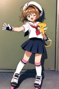 1girl, roller skates, skates, kinomoto sakura, kero, one eye closed, brown hair, skirt, knee pads, school uniform, white headwear, green eyes, gloves, elbow pads, tomoeda elementary school uniform, hat, star (symbol), short hair, pleated skirt, fingerless gloves, inline skates, smile, short sleeves, full body, open mouth, serafuku, antenna hair, black skirt, shirt, white shirt, white sailor collar, sailor collar, pink gloves,   <lora:Card Captor Sakura Anime:0.8>