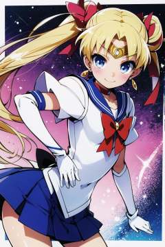 1girl, solo, blonde hair, tsukino usagi, sailor moon, sailor senshi uniform, long hair, blue sailor collar, gloves, blue eyes, skirt, bow, twintails, red bow, blue skirt, magical girl, sailor collar, choker, double bun, elbow gloves, hair bun, white gloves, back bow, jewelry, tiara, red choker, smile, crescent, hand on hip, earrings, pleated skirt,   <lora:Haga yui:0.8>