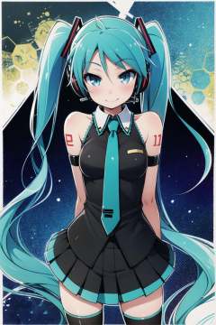 1girl, long hair, solo, hatsune miku, thighhighs, twintails, skirt, detached sleeves, very long hair, necktie, smile, aqua eyes, aqua hair, tattoo, shirt, black thighhighs, sleeveless, zettai ryouiki, black skirt, looking at viewer, headset, sleeveless shirt, hair ornament, pleated skirt, bare shoulders, aqua necktie, headphones, shoulder tattoo, white shirt, standing, black sleeves, miniskirt,   <lora:Haga yui:0.8>