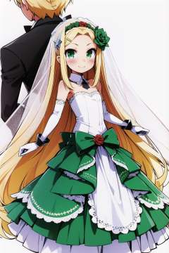 Astarotte Ygvar, 1girl, solo, bouquet, blonde hair, long hair, green eyes, tail, flower, dress, wedding dress, pantyhose, smile, veil, demon tail, gloves, hair ornament, elbow gloves, bridal veil, blush, simple background, rose, white pantyhose,   <lora:Haga yui:0.8>