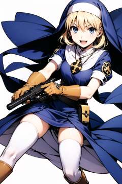 Rosette Christopher, 1girl, solo, blonde hair, weapon, gun, holding, thighhighs, nun, blue eyes, dual wielding, gloves, handgun, cross, habit, jewelry, open mouth, white thighhighs, white background, boots, necklace, simple background, smile, holding weapon, pendant watch, holding gun, holster, :d,   <lora:Moriyama Daisuke_v2:0.8>