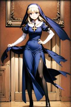 1girl, solo, blonde hair, pantyhose, long hair, hat, torn clothes, cross, dress, nun, jewelry ,  <lora:Moriyama Daisuke_v2:0.8>