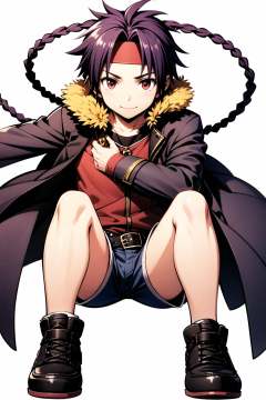 AChrno, solo, 1boy, short hair, male focus, red eyes, coat, shorts, headband, shoes, purple hair, full body, white background, smile, pants, single braid, bow, ribbon, simple background, belt,  <lora:Moriyama Daisuke_v2:0.8>