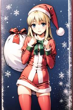 1girl, solo, Rosette Christopher, blonde hair, santa costume, christmas, thighhighs,  blue eyes, snow, blush, santa hat, sack, ,  <lora:Moriyama Daisuke_v2:0.8>