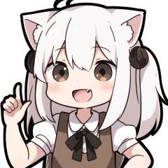 1girl, solo, animal ears, brown eyes, long hair, short sleeves, white background, shirt, smile, fang, simple background, puffy sleeves, puffy short sleeves, white shirt, ahoge, open mouth, white hair, arm up, cat ears, :d, bangs, dress, animal ear fluff, hair between eyes, hair ornament, upper body, brown dress, index finger raised, collared shirt, very long hair, blush, sleeveless, pointing up, pointing, <lora:biaoqingbao:0.8>