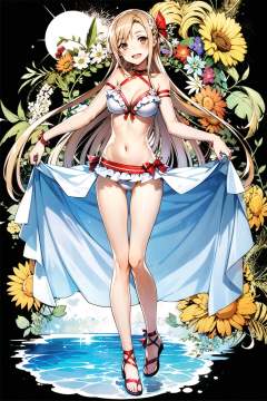 asuna (sao), 1girl, swimsuit, bikini, breasts, long hair, solo, navel, cleavage, smile, white background, brown hair, open mouth, full body, brown eyes, sarong, ;d, white bikini, looking at viewer, frilled bikini, hair ornament, very long hair, frills, simple background, collarbone, flower, sandals, medium breasts, bow, hair flower, ribbon, ankle ribbon, blush, bare shoulders, standing, halterneck, braid, shiny, long legs, shiny skin, leg ribbon, large breasts, jewelry, red ribbon,<lora:abec:0.8>