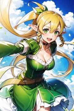 leafa,long hair, 1girl, solo, breasts, blonde hair, cleavage, green eyes, wings, pointy ears, open mouth, fairy wings, teeth, outstretched arms, smile, upper teeth only, very long hair, :d, hair ornament, sky, braid, twin braids, cloud, fairy, bangs, spread wings, cloudy sky, collarbone, flying, ponytail, long sleeves, fantasy, hair between eyes, green dress, choker, outdoors, blue sky, looking at viewer, white sleeves, large breasts, green wings, floating hair, bracelet, day,<lora:abec:0.8>