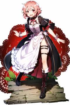 lisbeth (sao), 1girl, solo, white background, simple background, pink hair, boots, short hair, full body,white apron, open mouth,  smile, red eyes, cross-laced footwear, ribbon, looking at viewer, hair ornament, knee boots, :d, standing, lace-up boots, thigh strap,<lora:abec:0.8>