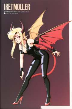1girl, solo, tail, wings, demon girl, horns, pointy ears, thighhighs, long hair, red eyes, demon tail, breasts, bridal gauntlets, retro artstyle, demon wings, long fingernails, 1990s (style), blonde hair, leotard, fingernails, facial mark, full body, red leotard, medium breasts, cleavage, bat wings, nail polish, forehead mark,<lora:Kenichi Sonoda:0.8>