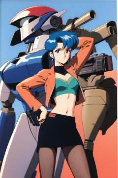 1girl, jewelry, gun, earrings, robot, weapon, mecha, blue hair, short hair, brown eyes, skirt, handgun, pantyhose, midriff, holding, holding gun, retro artstyle, jacket, katsuragi misato, solo,<lora:Kenichi Sonoda:0.8>