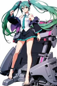 1girl, long hair, solo, hatsune miku, barefoot, twintails, very long hair, gradient hair, multicolored hair, skirt, toenails,  simple background, smile, standing on one leg, purple hair, white background, aqua hair, full body, bare shoulders, leg ribbon, standing, green hair, feet, ankle ribbon,<lora:Kenichi Sonoda:0.8>,
