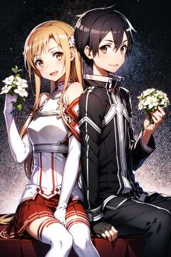 1girl, kirito, asuna (sao), breastplate, 1boy, black hair, long hair, armor, back-to-back, thighhighs, brown hair, flower, skirt, brown eyes, white armor, sitting, black eyes, holding, smile, detached sleeves, gloves, fingerless gloves, pleated skirt, red skirt, looking at viewer, open mouth, bare shoulders, hair ornament, black gloves, short hair, white thighhighs, white flower, long sleeves, hair flower, :d, miniskirt, holding flower,<lora:abec_v2:0.8>
