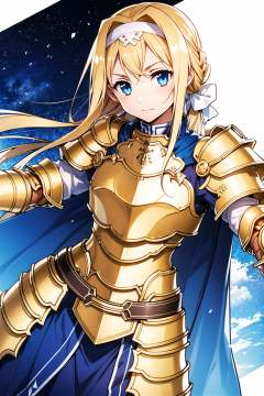 1girl, armor, long hair, alice zuberg, solo, blonde hair, blue eyes, weapon, blue cape, knight, sword, hairband, shoulder armor, dutch angle, sheath, cape,(gold breastplate:1.5), looking at viewer, white hairband, very long hair, braid, sheathed, pauldrons,gold armored dress, fantasy, white bow,(gold body armor:1.5), standing, blue dress, bangs, bow, dress, faulds, gauntlets, floating hair, white ribbon, sidelocks, ribbon, closed mouth, hair bow,<lora:abec_v2:0.8>