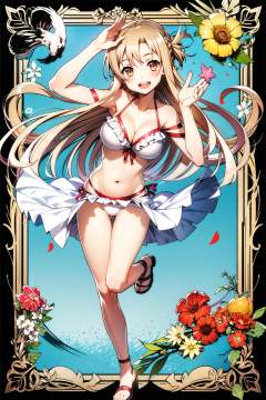 asuna (sao), 1girl, swimsuit, bikini, breasts, long hair, solo, navel, cleavage, smile, white background, brown hair, open mouth, full body, brown eyes, sarong, ;d, white bikini, looking at viewer, frilled bikini, hair ornament, very long hair, frills, simple background, collarbone, flower, sandals, medium breasts, bow, hair flower, ribbon, ankle ribbon, blush, bare shoulders, standing, halterneck, braid, shiny, long legs, shiny skin, leg ribbon, large breasts, jewelry, red ribbon,<lora:abec_v2:0.8>