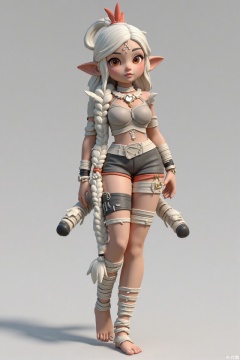 Disney style,Pixar 3D illustration,Heres a lone orc girl. Her white hair is in a single long braid. She has medium breasts, a porcelain - like skin tone (another different skin tone option), and red eyes that draw you in. A tattoo is present on her, and shes walking barefoot. Her dress is a combination of bandages and jewelry, looking quite distinctive. A feather - adorned headpiece sits gracefully on her head, making her stand out.