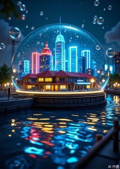 Photorealistic CGI, cityscape inside a glass dome, colorful buildings, vibrant lights, reflections on water, bubbles floating around, futuristic architecture, neon lights, night setting, water ripples, detailed textures, high contrast, soft lighting, serene atmosphere, urban fantasy, no people, reflective surfaces, clean lines, whimsical feel, clear glass dome, modern city, bright lights, calm water, colorful city, blue and yellow hues, digital art, no visible artist signature, high resolution, intricate details, no visible watermark, no visible text, no visible background, no visible horizon, no visible sky, no visible clouds, no visible ground, no visible horizon, no visible trees.