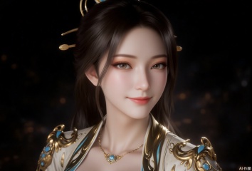1girl,solo,jewelry,upper body,necklace,smile,hair ornament,looking at viewer,dress,closed mouth,realistic,brown hair,breasts,black hair,black background,long hair,chinese clothes,3,cover,gradient background,close-up details,outstanding style,adding a touch of dimension to your images without compromising details,close-up