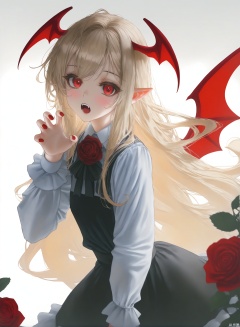 masterpiece,best quality,high quality,chromatic_aberration,light,(colorful:0.5),fair_skin,very aesthetic,absurdres,amazing quality,(aestivation:0.4),(nasii:0.4),(toosaka asagi:0.4),(atdan:0.4),(artist:quasarcake:0.8),(iumu:0.72),(wlop:0.72),96YOTTEA,Konya Karasue,//masterpiece,best quality,chromatic aberrationgood work,illustration,depth of field,(color),masterpiece,best quality,good work,illustration,depth of field,cowboy shot,((best quality)),((masterpiece)),1girl,solo,long hair,looking at viewer,blush,open mouth,bangs,skirt,blonde hair,simple background,shirt,red eyes,long sleeves,white background,black shirt,flower,frills,wings,pointy ears,fang,collared shirt,black skirt,rose,fangs,bat wings,frilled skirt,head wings,red flower,red rose,petticoat,claw pose,vampire,vampy,Gothic