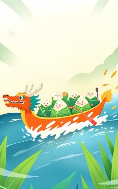 A joyful scene of anthropomorphic zongzi (rice dumplings) racing in a banana-shaped boat with a dragon head. Each zongzi wears a tiny life jacket and paddles furiously, surrounded by swirling green reed leaves and golden rice grains splashing in their wake.
