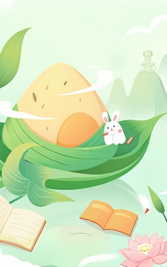 DWJ, A whimsical, digital illustration in a soft, pastel color palette featuring a large, yellow egg with brown speckles in the center. Surrounding the egg are lush, green leaves and a white rabbit with a gentle expression. The background includes rolling hills and a distant figure wearing a traditional outfit, standing atop the hills. The foreground has a partially opened book and a pink lotus flower. The scene is serene and dreamlike, with a gentle, pastel green sky. The overall style is soft and whimsical, with a focus on nature and tranquility.
