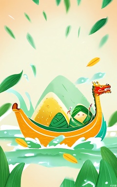 DWJ, A joyful scene of anthropomorphic zongzi (rice dumplings) racing in a banana-shaped boat with a dragon head. Each zongzi wears a tiny life jacket and paddles furiously, surrounded by swirling green reed leaves and golden rice grains splashing in their wake.