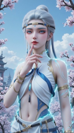 Blue electro - optical effects surround the limbs, enhancing the xianxia - fantasy ambiance.