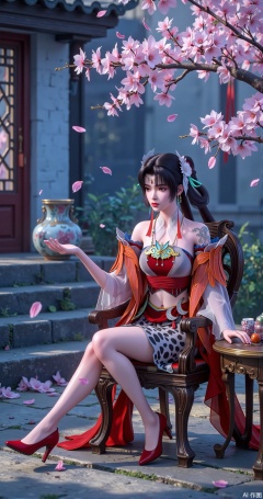 Her crossed legs are faintly visible under the black silk mist. The scarlet high - heeled shoes are like two cinnabar dots falling on an ink - wash painting, engaging in a dialogue across time and space with the pink - glazed porcelain vase inside the window lattice of the Chinese - style building behind. In the courtyard with blue bricks and black tiles, the cherry blossoms are like a rolling rosy cloud. The falling petals spread out like a fragrant sea of snow on the stone steps. The cherry petals resting on the edge of the wooden tea table and her slender hand gently placed on the table edge form a delicate golden ratio. The most wonderful thing is the mirror magic of the glass - flower window - the cherry branches in the bottle are both the real scene and the reflection, making the framed - view aesthetics of traditional gardens and the sense of transparency and overlap of modern materials blend seamlessly in a small space. This frame of the picture is like a visual symphony jointly composed by natural creatures and human cultural creations, with every detail whispering the whispers of spring.