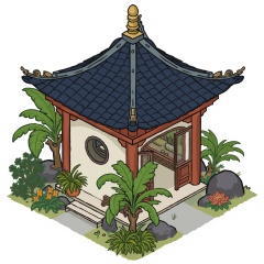 This is a digital drawing of a traditional Chinese garden pavilion with a pagoda-style roof, featuring dark blue tiles and ornate wooden beams. The structure is surrounded by lush greenery, including a large banana plant and various flowers. The pavilion has a circular window and a small, arched doorway. The background includes rocks and a serene, tranquil setting
