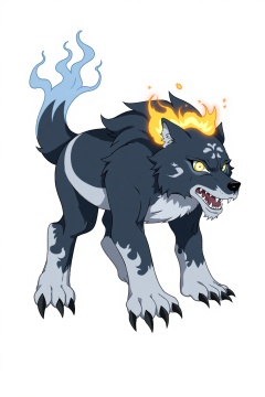 HEZI, Character Design, animation art, quadratic, bright colors, , no humans, solo, white background, pokemon \(creature\), wolf, simple background, full body, black fur, glowing eyes, alternate color, claws, yellow eyes, fusion, glowing, teeth, open mouth, tail, looking at viewer, blue fire, grey fur, blue eyes, white fur, shiny pokemon, fire, sharp teeth, fangs, colored sclera, animalization, animal focus