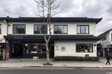 landscapejam,zssyj,Photograph of a street scene in an Asian city. A bare tree trunk stands in the foreground with a black and white building behind it. The building has traditional Chinese architectural elements with a tiled roof and ornate details. A person in a long coat walks on the sidewalk, facing away. A large advertisement board with Chinese characters and images is mounted on a pole in front of the building. The sky is overcast, casting a soft light over the scene. The image has a muted color palette with cool tones.
