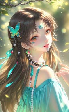 masterpiece,very aware,highres,absurdres,newest,best quality,loli,petite,high quality,chromatic_aberration,chromatic_aberration,cinematic_angle,dutch angle,//,1girl, facial_mark, forehead_mark, solo, brown_hair, hair_ornament, green_dress, long_hair, upper_body, dress, jewelry, teeth, smile, looking_at_viewer, braid, necklace, earrings, beads, leaf, from_side, parted_lips, looking_back, light_particles, ribbon, light_rays, branch, bug, butterfly_hair_ornament//,//,photorealistic,Artist:na-ga,(quasarcake:0.2),(wanke:0.9),[Artist:chen bin],Artist:tidsean,[Artist:sk (askzy)],(artist:tokkyu:0.5),(artist:momoko \(momopoco\):0.5),himitsu_(hi_mi_tsu_2),//,<lora:MAQ326——【noob】hans:0.5>,<lora:sansu——【noob】hans:0.8>,