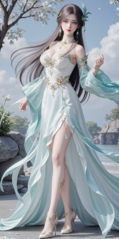 Ultra clear, wallpaper, 8k, Golden eyes,masterpiece, masterpiece,best quality,high quality,,chromatic_aberration,Hair accessories,tree,blue sky ,river,Super long legs,stone,white silk,green shirt ,fullmoon ,High heeled sandals,earring,blue hair,Light Blue Theme,long legs ,thin legs (masterpiece,wallpaper,best quality:2),1girl,full body,hanfu,full_shot,wallpaper,full body,beautiful legs,seductive_smile,socks_removed, looking_at_viewer,dumpling_Hug_Pillow,cleavage,huge Breasts,embossed high heels,plns_high heels,huaxiangr,silk,magnificent