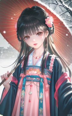 1girl, solo, umbrella, black hair, snow, hanfu, oil-paper umbrella, flower, hair ornament, chinese clothes, snowing, jewelry, brown eyes, nail polish, necklace, holding, outdoors, parasol, hair flower, long hair