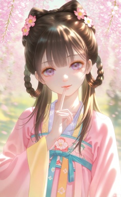 1girl, flower, wisteria, hair ornament, solo, hanfu, chinese clothes, brown hair, hair flower, purple eyes, looking at viewer, dappled sunlight, sunlight, wide sleeves, smile, closed mouth, long sleeves, hair rings, blurry, upper body, day, mole under eye, blurry background, depth of field, mole, outdoors, finger to mouth, long hair, white flower, holding, pink flower