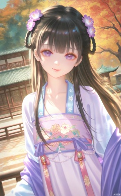 1girl, hair flower, black hair, hair ornament, flower, solo, chinese clothes, hanfu, purple eyes, long hair, looking at viewer, architecture, east asian architecture, autumn leaves, outdoors, floral print, smile, closed mouth, leaf, long sleeves, upper body, railing, standing, purple flower, tree, blurry, autumn, building, purple dress