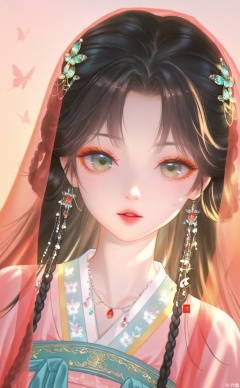 hanfu,1girl, butterfly, bug, solo, looking at viewer, one eye covered, green eyes, jewelry, long hair, veil, black hair, necklace, upper body, parted lips, gem, straight-on, red lips, hair ornament, makeup, braid, lips