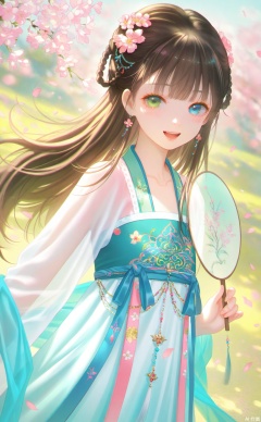 hanfu,1girl, hanfu, chinese clothes, solo, hair ornament, green eyes, smile, heterochromia, hair flower, flower, dress, holding, long hair, see-through sleeves, brown hair, blue dress, blue eyes, from side, looking at viewer, hand fan, long sleeves, cherry blossoms, see-through, holding fan, earrings, blurry background, petals, teeth, jewelry, blush, outdoors