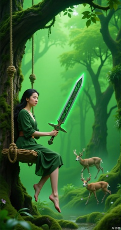 The woman is holding a large green sword in her right hand and is looking off into the distance with a peaceful expression on her face