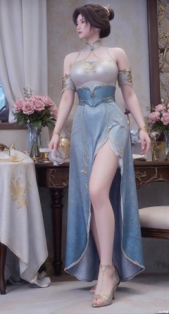 (masterpiece:1.2),best quality,Ultra clear, wallpaper, 8k, masterpiece, 1girl, solo, long hair, breasts, looking at viewer, bangs, large breasts,long dress,, bare shoulders, jewelry, black hair, standing, purple eyes, full body, flower, thighs, indoors, hair bun, long dress, high heels, cup, see-through, book, bare legs, window, table, white footwear, standing on one leg, curtains, pink flower, side slit, vase, ,(huge breasts:2.99),(full breasts:2.99),,,(pink rose flowers:1.59),,XlimuwanXJCB,XcaiyunxianziK,XzilingK,Xsiyudan,XyouqianxueK