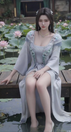(masterpiece:1.2),best quality,The image is a digital illustration of a young woman sitting on a wooden bench in a pond with lily pads. She is wearing a long dress with design on the chest and sleeves. The dress has a high neckline and short sleeves,Holding a lotus in hand. She has long dark hair styled in loose waves and is wearing gold high heels. The woman is posing with one hand on her hip and the other resting on the edge of the bench. The background is filled with pink and white lotus flowers and green leaves. The overall mood of the image is peaceful and serene,(huge breasts:2.99),(full breasts:2.99),(Background with traditional Chinese architecture,Pond, water lilies:1.39),,(huge breasts:2.99),(full breasts:2.99),,,(pink rose flowers:1.59),,XlimuwanXJCB,XcaiyunxianziK,XzilingK,Xsiyudan,XyouqianxueK