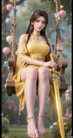 The swing is made of wood and is decorated with colorful lollipops, candy canes, and balloons