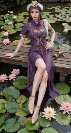 (masterpiece:1.2),best quality,The image is a digital illustration of a young woman sitting on a wooden bench in a pond with lily pads. She is wearing a long dress with design on the chest and sleeves. The dress has a high neckline and short sleeves,Holding a lotus in hand. She has long dark hair styled in loose waves and is wearing gold high heels. The woman is posing with one hand on her hip and the other resting on the edge of the bench. The background is filled with pink and white lotus flowers and green leaves. The overall mood of the image is peaceful and serene,(huge breasts:2.99),(full breasts:2.99),(Background with traditional Chinese architecture,Pond, water lilies:1.39),,XzhihuaX,Xleidianjiangjun,Xyuenanaodai,XmeiningSMW,XhaiyuejiCosplay,Xyoulingniang,XbachongshenziCOS,XjiaodaiqunDHL,Xshuilian,Xhujiaoer,XshanhugongxinhaiCOS,XshengcaierX2,Xxiuhefu,Xsiyudan,XjiangchenY,XyouqianxueK
