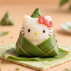 Hello Kitty is wrapped in bamboo leaves and placed on a mat with bamboo leaves, against a light brown countertop, simple and cozy.zongzi,