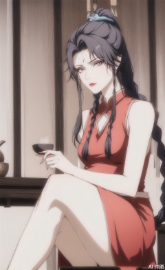 Wearing a red cheongsam and a Chinese cheongsam, sitting in a teahouse with tea on a small table, sitting on a stool with crossed legs in the teahouse,